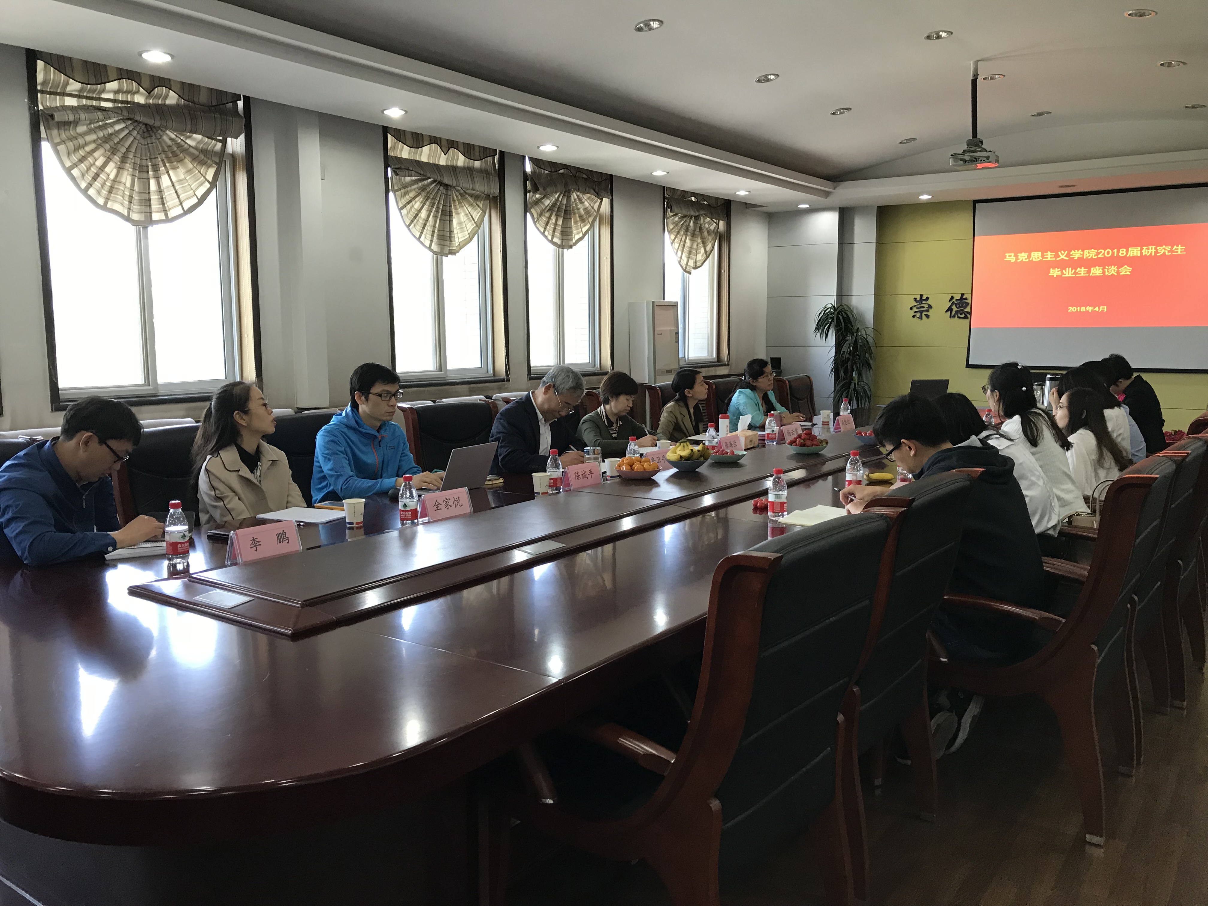 党委书记鲁卫平,院长助理李鹏、全家悦,学院教师代表高旭红、陈诚平,以及2018届研究生毕业生代表参加座谈会。