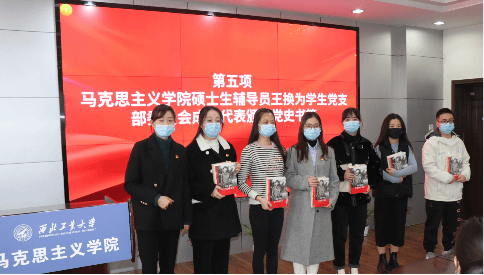 硕士生辅导员王换为学生党支部委员会成员代表颁发了党史书籍,鼓励学生支委带动全体学生要用好这些红色资源,组织广大党员重点学习党史,同时学习新中国史、改革开放史、社会主义发展史,做到学史明理、学史增信、学史崇德、学史力行,做到学党史、悟思想、办实事、开新局。