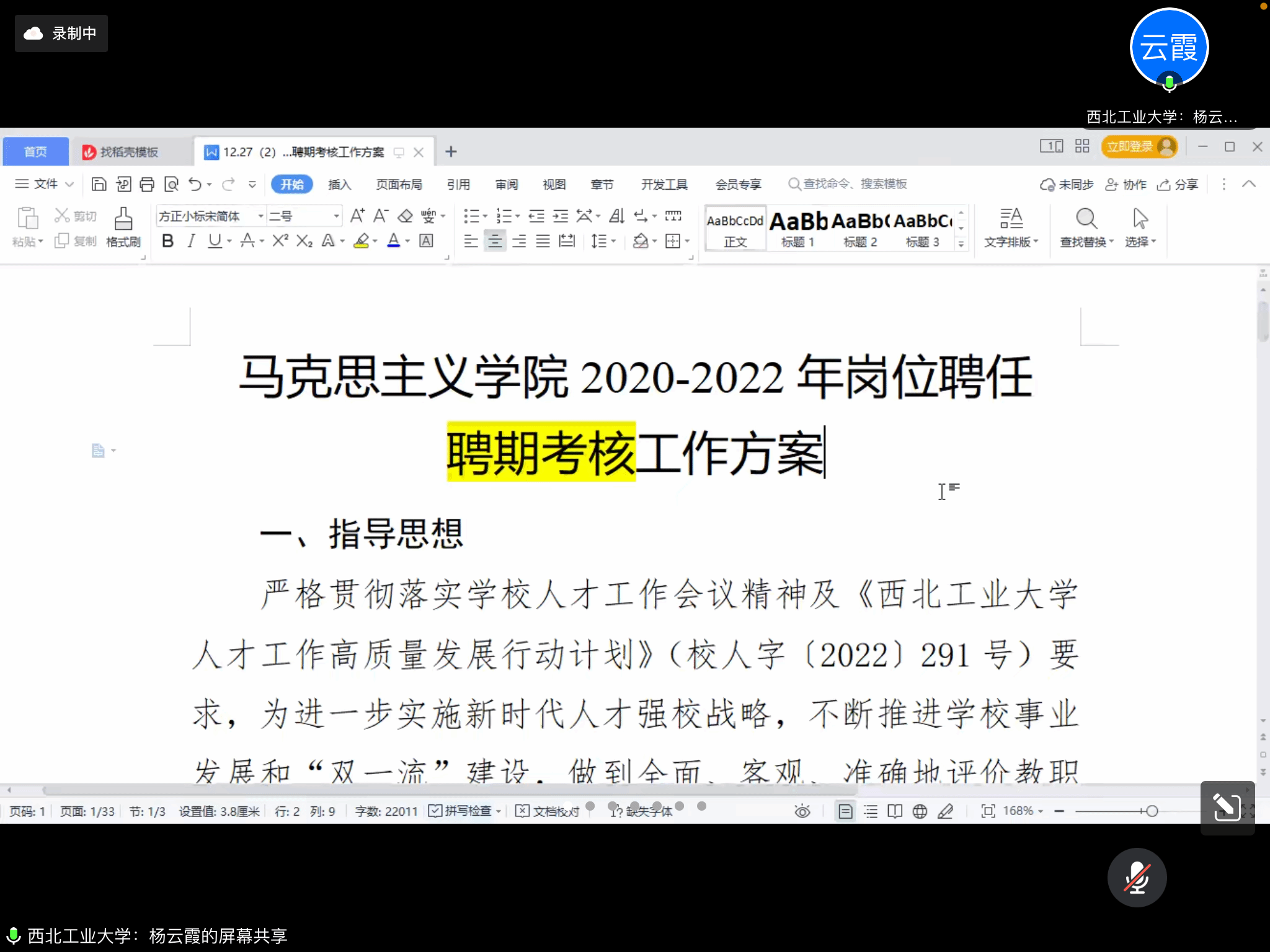2020—2022年岗位聘任聘期考核工作方案》(以下简称《方案》)是学院根据学校的相关文件制定的针对2020年1月1日至2022年12月31日三年聘任聘期的考核工作方案,考核将坚持师德师风第一标准,坚持公平、公正、客观评价,强化考核激励与约束机制的原则展开,各位老师要严格按照《方案》要求如实填写相关材料,经学院核查无误后进行评议评审。会上,参会人员就《方案》进行审议,并采取线上表决的方式通过了该方案。