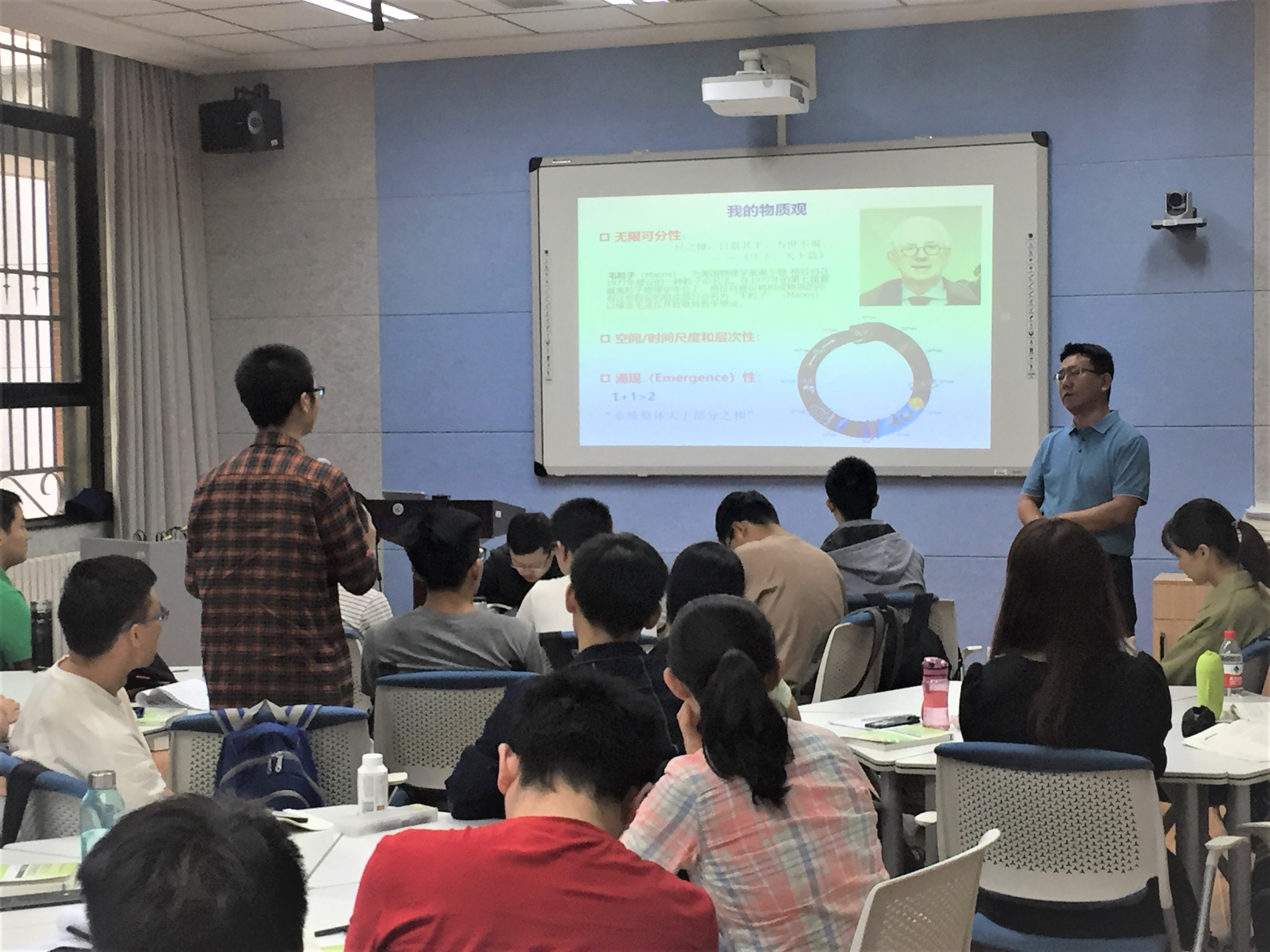 同学们听得意犹未尽,又与两位老师展开了交流。这堂课,老师们既从马克思主义哲学的角度讲授,又从物理学的角度讲授,知识传授相得益彰,让同学们在与众不同的思政课体验中,更加巩固了所学知识,对于马克思主义哲学世界起源于物质有了更加深刻地理解。