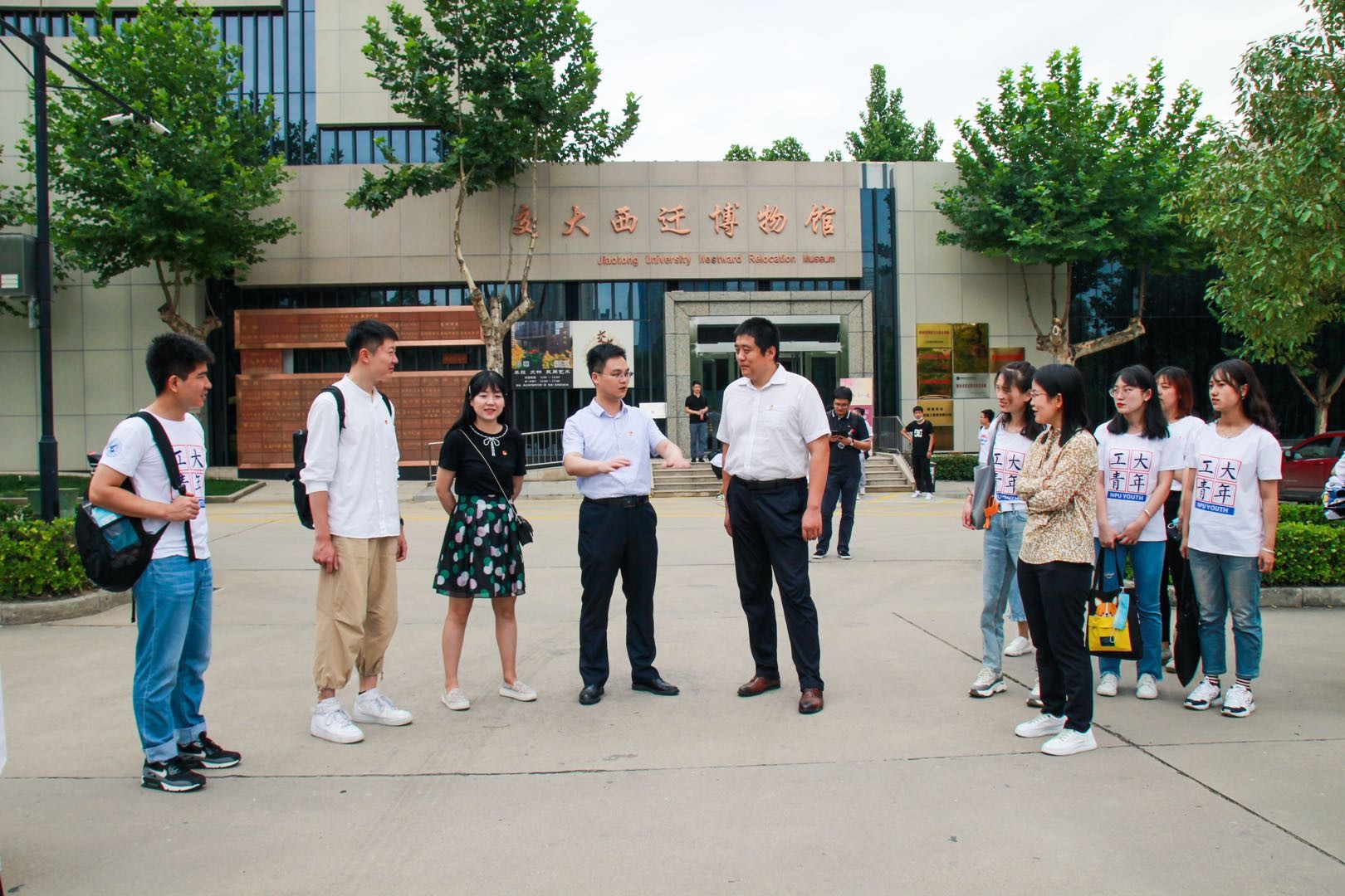 图为青马实践队成员在西安交大西迁博物馆前交流