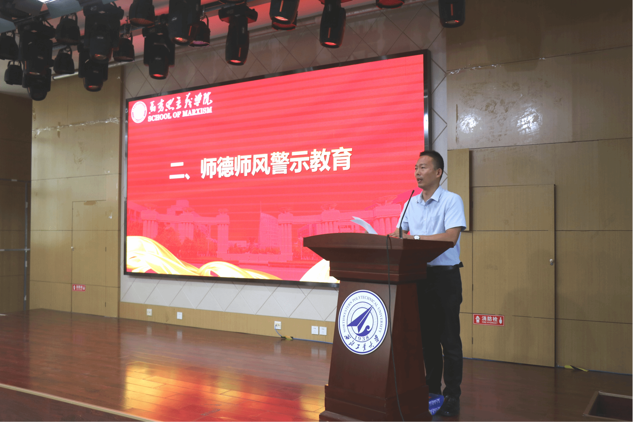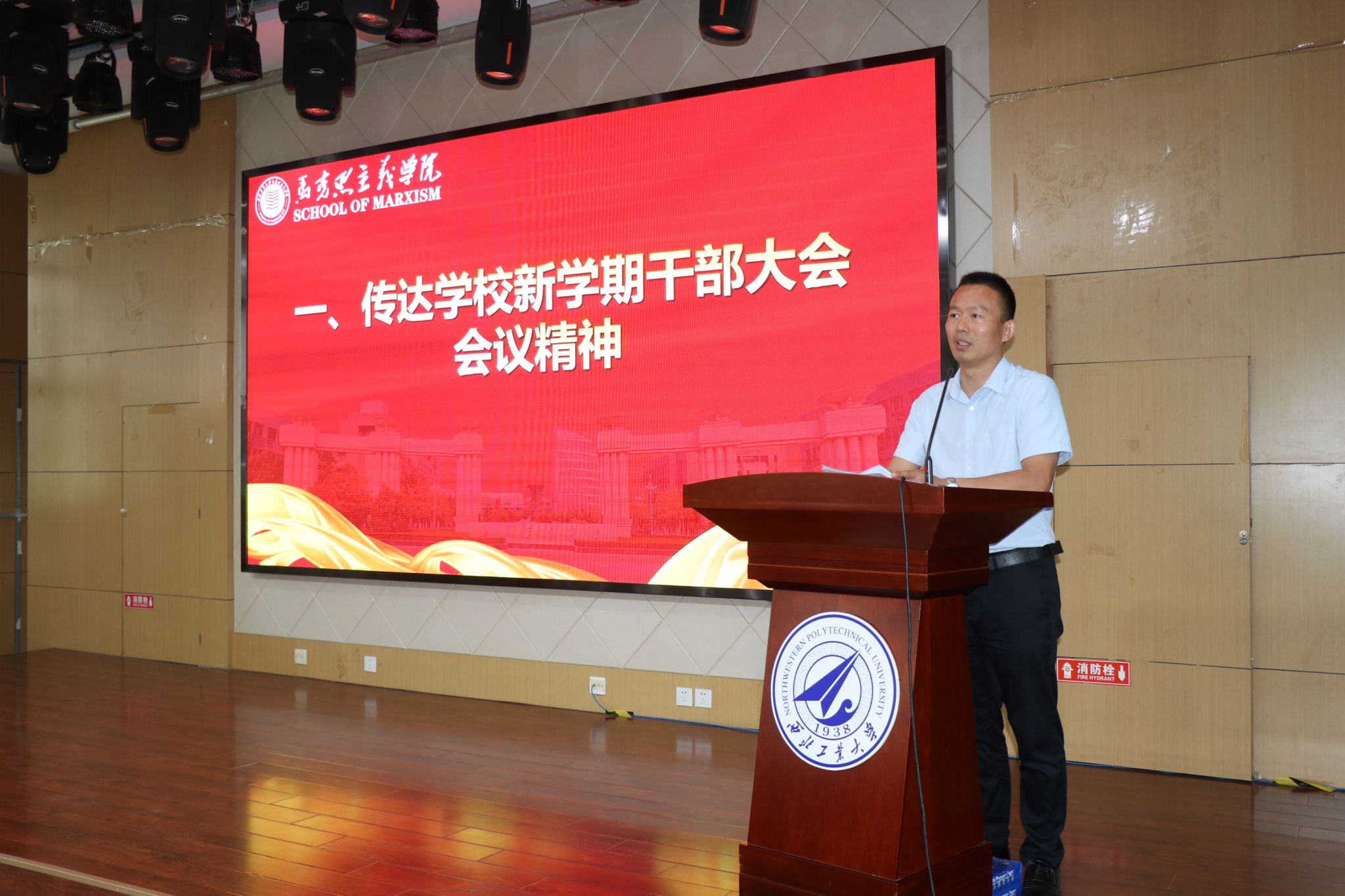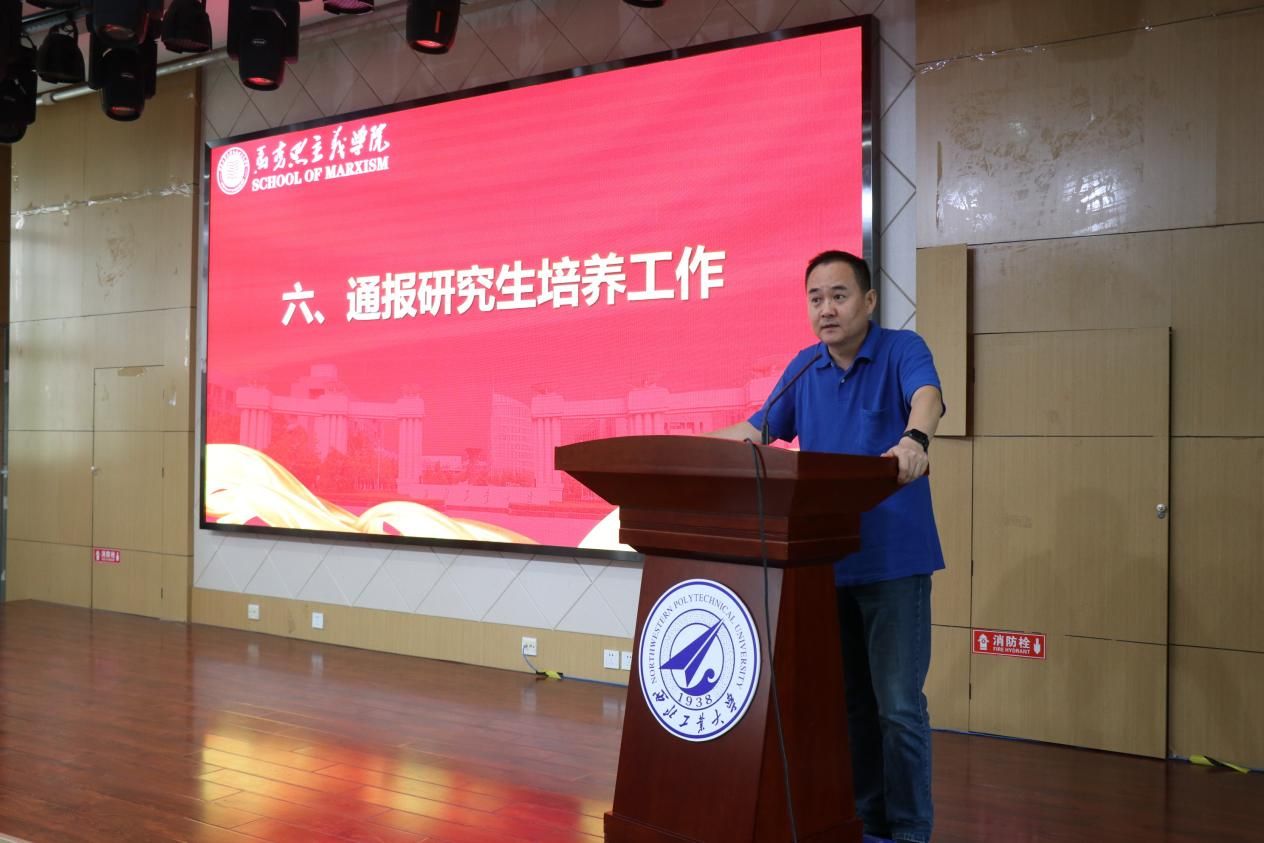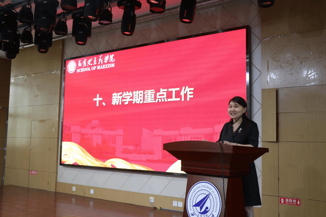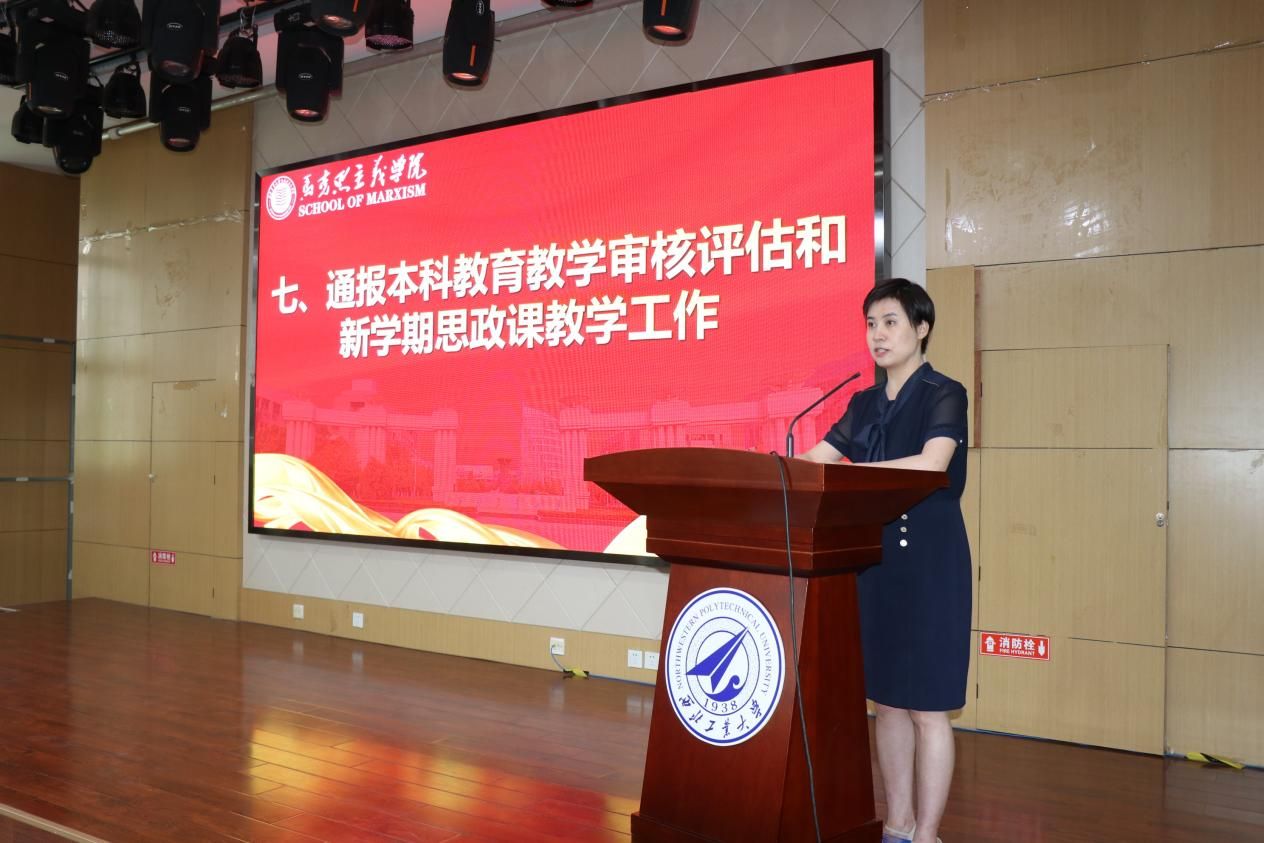 学院副院长贺苗通报本科教育教学审核评估和新学期思政课教学工作。她再次强调了教学档案的规范整理工作和注意事项;同时,强调了新学期的思政课教学工作需要加强意识形态层面的重要性的认识,教师要进一步加强“总师育人文化”和学校“127”目标的阐释,加强对西工大元素的体现,不断增加教学产出。