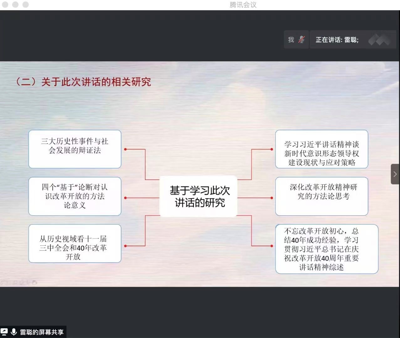 硕士生雷聪进行导读,她具体分析谈到为什么我们党作出改革开放的历史性决策和对改革开放的评价、三大里程碑以及十个“始终坚持”等内容做了详细的分析与梳理,重点解读了《习近平在庆祝改革开放40周年大会上的讲话》中所提到的四个“基于”,最后她还提出了自己的相关思考与问题。紧接着由泰国A片