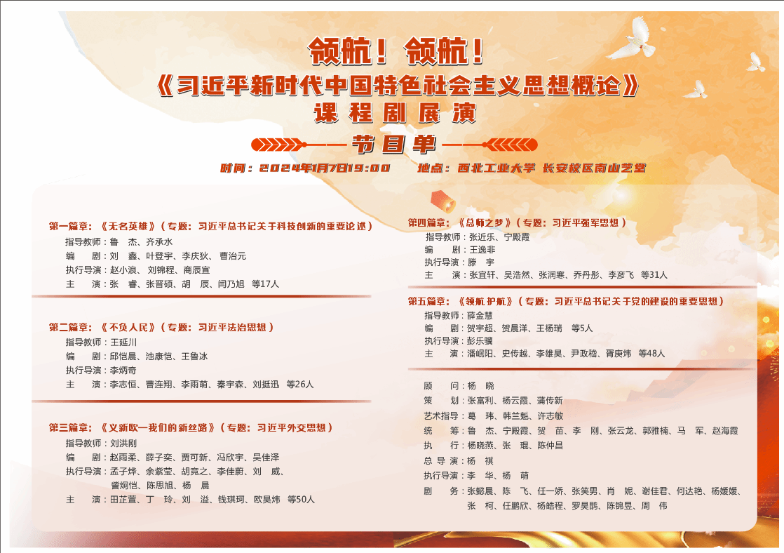 本次展演共5个子剧目,分别根据《概论》课中的“习近平总书记关于科技创新的重要论述、习近平法治思想、习近平外交思想、习近平强军思想、 习近平总书记关于党的建设的重要思想”等5个专题进行创作。泰国A片