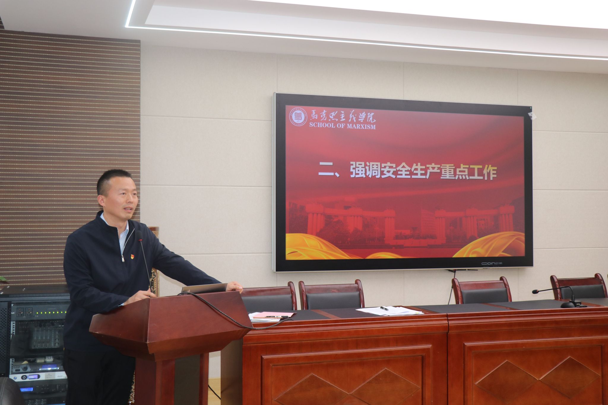 随后,蒲传新通报近期安全生产工作的相关情况。他指出,每个人都是安全生产的“第一责任人”,对学院“有形”“无形”的安全生产都要高度重视,心中始终装着隐患分布“全景图”、风险处置“流程图”;强调了“牢记思政课课堂讲授纪律、各办公室设立第一安全责任人、坚守意识形态阵地、强化师德师风”等内容;全体教职工要切实提高政治站位,深刻汲取教训,压紧压实责任,认真排查隐患,狠抓工作落实,切实保障安全措施落实落细。