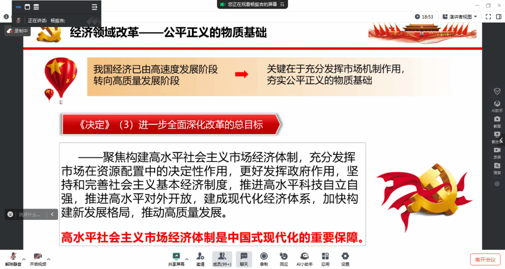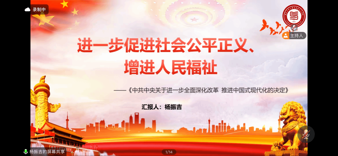 硕士生杨振吉作为首位导读人,深入解读了《中共中央关于进一步全面深化改革、推进中国式现代化的决定》(以下简称决定)中关于进一步全面深化改革的目标要求、根本途径和根本保证。她以促进社会公平正义、提高人民福祉为出发点,详尽阐释了全面深化改革的重大意义。改革为了人民、改革依靠人民、改革成果由人民共享,这是进一步促进社会公平正义、增进人民福祉的目标要求。推进中国式现代化是进一步促进社会公平正义、增进人民福祉的根本途径。坚持党的全面领导是进一步促进社会公平正义、增进人民福祉的根本保证。
