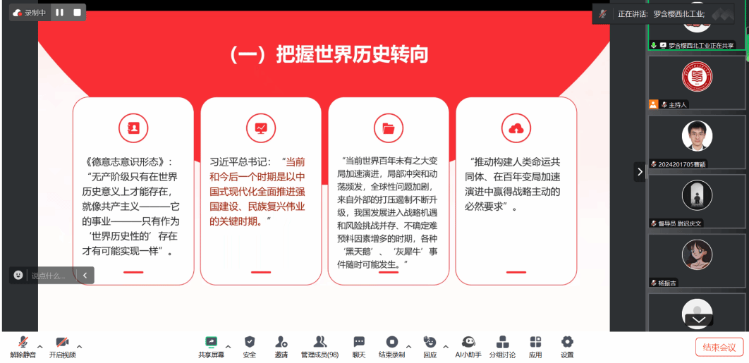 鲁杰思政课工作室主办,中国人民大学冯秀军教授作为对话教师,硕士生李红霞同学主持,中国高等教育学会马克思主义研究分会督导组成员尉迟庆文同学应邀参与,通过线上交流的形式,为师生们搭建了一个思想交流、智慧碰撞的平台。