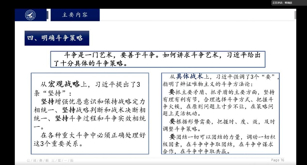 博士生韩瑞欣同学,从围绕关于发扬斗争精神系列重要论述的文本梳理、关于发扬斗争精神系列重要论述的主要内容与关于发扬斗争精神系列重要论述的内在逻辑三个方面对文本内容进行了全面系统的解读。在内在逻辑方面,韩瑞欣同学思考深入,逻辑严谨,学术规范,具有较强的学理性,带给大家一定的启迪。