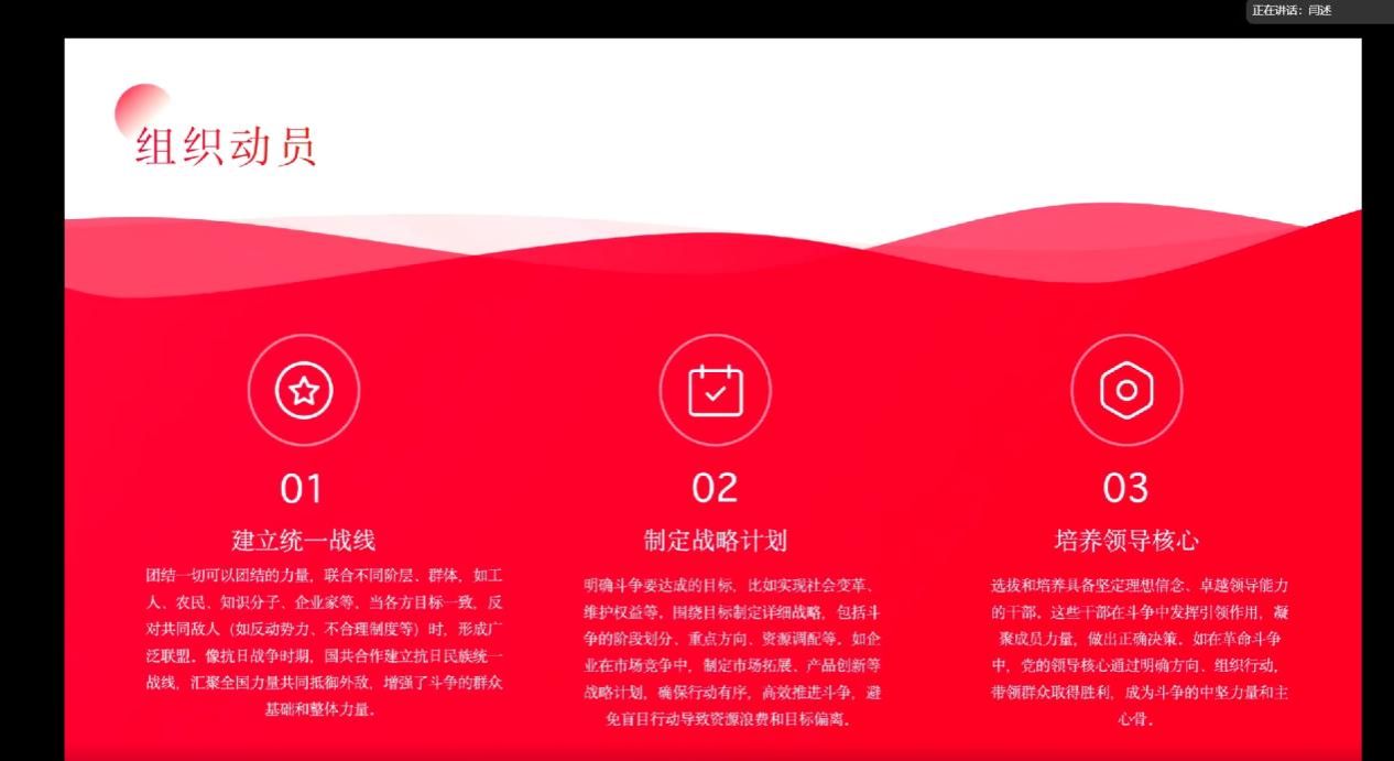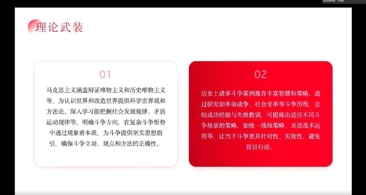 硕士生闫述同学作为首位导读人,从伟大斗争的定义、必要性、新特点、准备、目标与方向和实践与展望六个方面对《怎样理解必须准备具有许多新的历史特点的伟大斗争》的文本内容进行了深入浅出的解读。首先,她运用可视化分析和大家分享了关于伟大斗争定义相关的学术研究现状,帮助大家更好地了解当前的研究要点;其次,从历史背景的复杂性、斗争目标的明确性和参与主体的广泛性对伟大斗争的鲜明特点进行了系统的分析,内容丰富,逻辑清晰。最后,她提出斗争是推动历史前进的动力,只有通过斗争才能实现国家的繁荣、民族的复兴和人民的幸福。