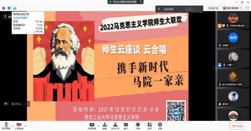 最后,线上联欢会在《我们都是追梦人》的合唱中圆满的落下帷幕。新的一年里,我们要继续追求理想,探索实践,用“公诚勇毅”的校训激励自己奋发图强,勇敢向前,共筑马院大家庭,相亲相爱一家人,互帮互助,共克时艰。