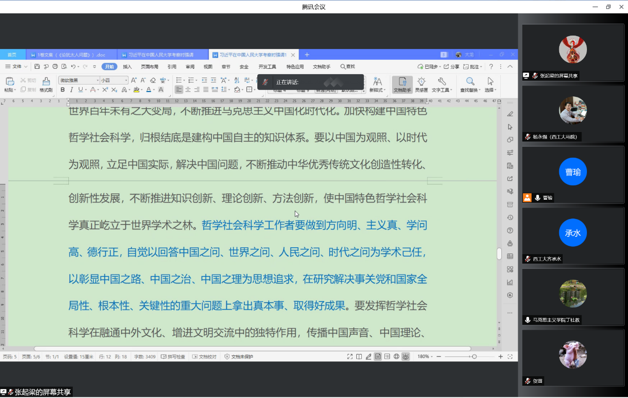 关于思政课建设和思政课教师队伍发展的新部署新要求,探寻当前“原理课”课程建设与改革创新等方面的意见,4月30日晚,马院马克思主义基本原理系党支部在线组织召开了讲话精神学习座谈会。马原系全系17名党员同志以及学院党委副书记(主持工作)蒲传新应邀参加会议,会议由支部书记曹瑜主持。