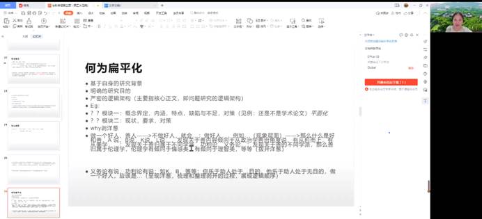 随后,吴兰丽老师从论文类别、学术规范、选题创新、论文写作等方面讲解了论文写作的相关问题。吴老师按照研究内容将论文划分为描述型、综述型、学术型论文,强调描述型论文不能简单罗列经典作家和其他学者的观点,还要发挥学术研究的主体性,阐述论证自己的学术观点;综述型论文需要根据严密的逻辑排序、构建纵横交错的网状结构,实现历史溯源、现状梳理和未来指引的有机结合。吴老师强调论文写作必须严格遵守学术规范,一方面,研究者要尊重自己的学术生命和学术声誉,杜绝学术不端行为;另一方面,学术型论文写作要遵循科学的研究范式,马克思主义理论类学术论文需要回归经典、回归学术史,使用科学的学术概念,坚持理论与实践的内生性。吴老师认为选题的创新性体现在材料、观点、方法、背景等多个方面,强调论文写作要坚持学术的“张力”和写作的“定力”,避免“扁平化”研究,既要保证论文框架的逻辑性和严密性,以“剥洋葱”的方式层层追问、深入内核,也要尝试引入不同的研究范式解读新旧问题。此外,吴老师还为大家介绍了《华中科技大学学报(社会科学版)》的办刊宗旨、栏目设置和发文风格,并分享了自己和投稿作者的交流心得。