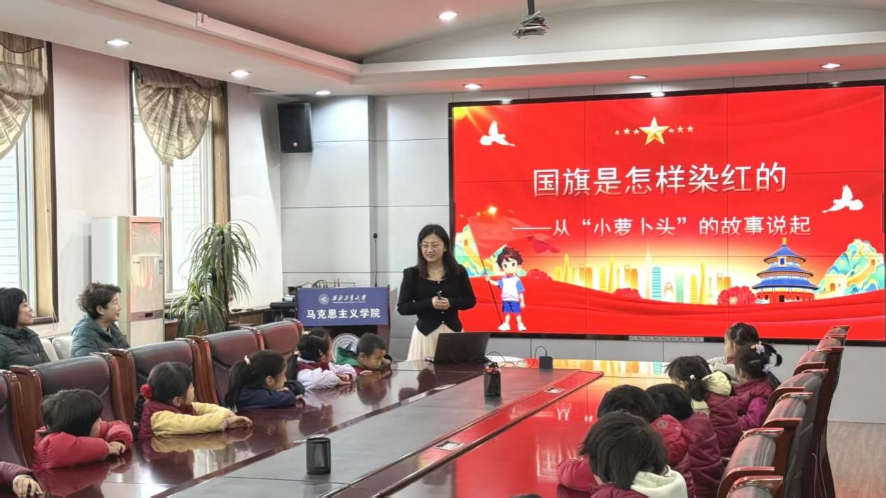 活动伊始,学院公共课教学秘书张笑男作为家长代表以“小萝卜头”宋振中的革命故事为切入点,用童趣化的语言、形象生动的讲述,向南山幼儿园大班小朋友们解读了五星红旗的组成与象征意义。通过对比“小萝卜头”在狱中艰苦的学习生活与小朋友们当下幸福的幼儿园时光,让孩子们直观感受革命先烈为新中国成立所付出的牺牲与奉献,理解国旗红色的深刻内涵,引导孩子们从小爱护国旗、尊敬国旗,萌发爱国情感。课堂上,小朋友们认真聆听、积极互动,对红色故事充满好奇,爱国种子在潜移默化中生根发芽。
