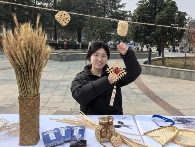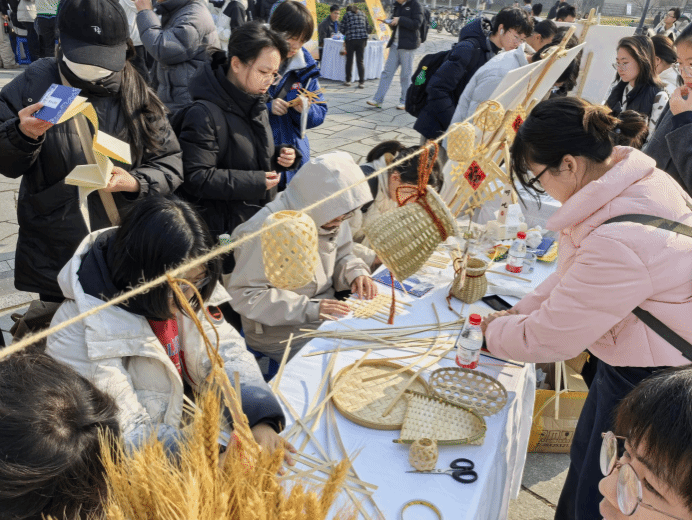 竹编制作区前人头攒动,学生们充分发挥创意,将普通的竹条编制成一个个精致的箩筐、竹篓、风铃;织布体验区布置的木制织布机吸引了同学们争相体验,大家从生疏地学习穿梭、挑纬,到编织出彩色纹样,沉浸在劳动的乐趣中。