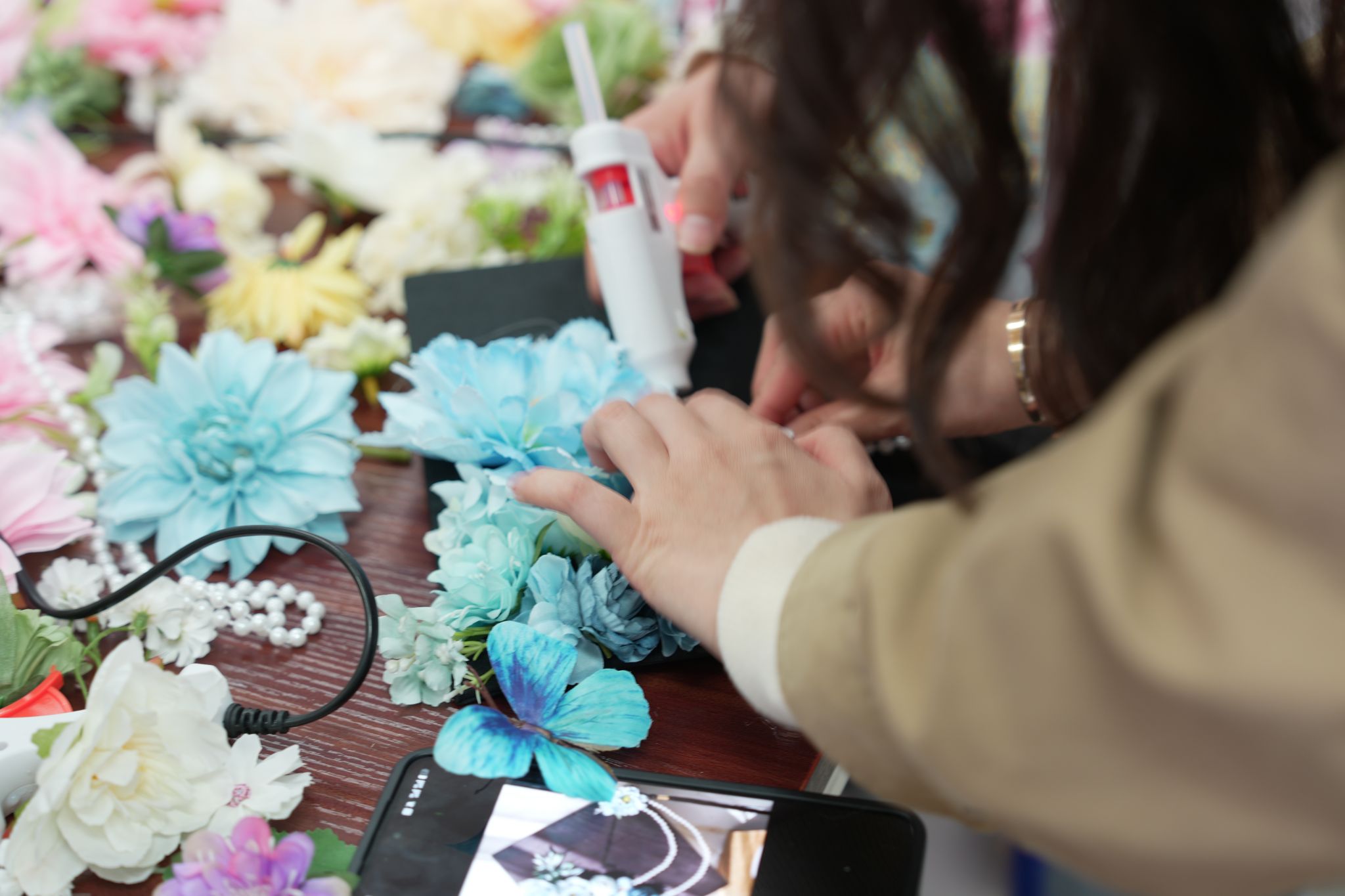 活动现场,学院精心准备了仿真花簇、珍珠串、字母贴、流苏、蕾丝花边等全套DIY材料,品类丰富、色彩多样,为同学们的创意发挥提供了充足保障。大家围坐长桌,或俯身专注用胶枪粘贴花饰,或交流设计思路、相互协作调整布局,指尖流转间,将校园时光与青春心愿融入每一处细节。有的同学以暖橙牡丹与粉紫小花铺陈帽檐,搭配精巧蝴蝶装饰,尽显温婉雅致;有的以浅蓝绣球与珍珠串珠勾勒轮廓,缀以镭射蝴蝶结,兼具优雅与个性;还有的用金色字母贴镌刻专属名字缩写,让学士帽成为独一无二的青春信物。