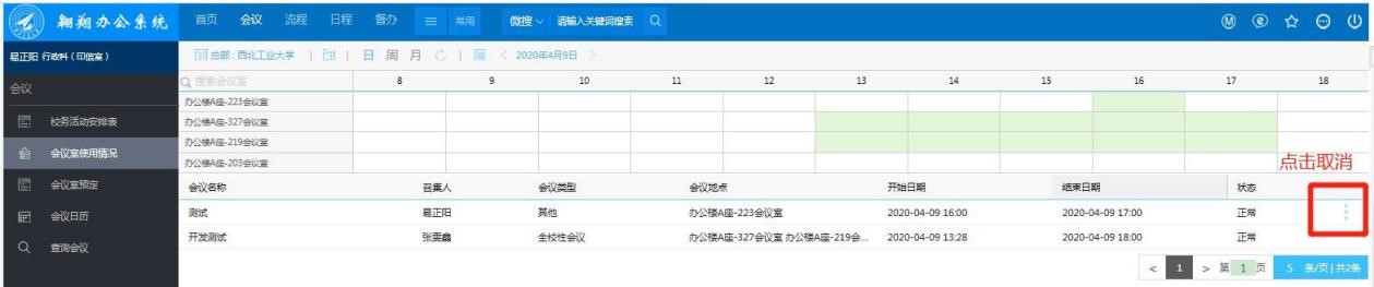 STEP3:取消会议室预定:在“会议”—“会议室使用情况”—点击本人预定信息右侧图标“取消”。