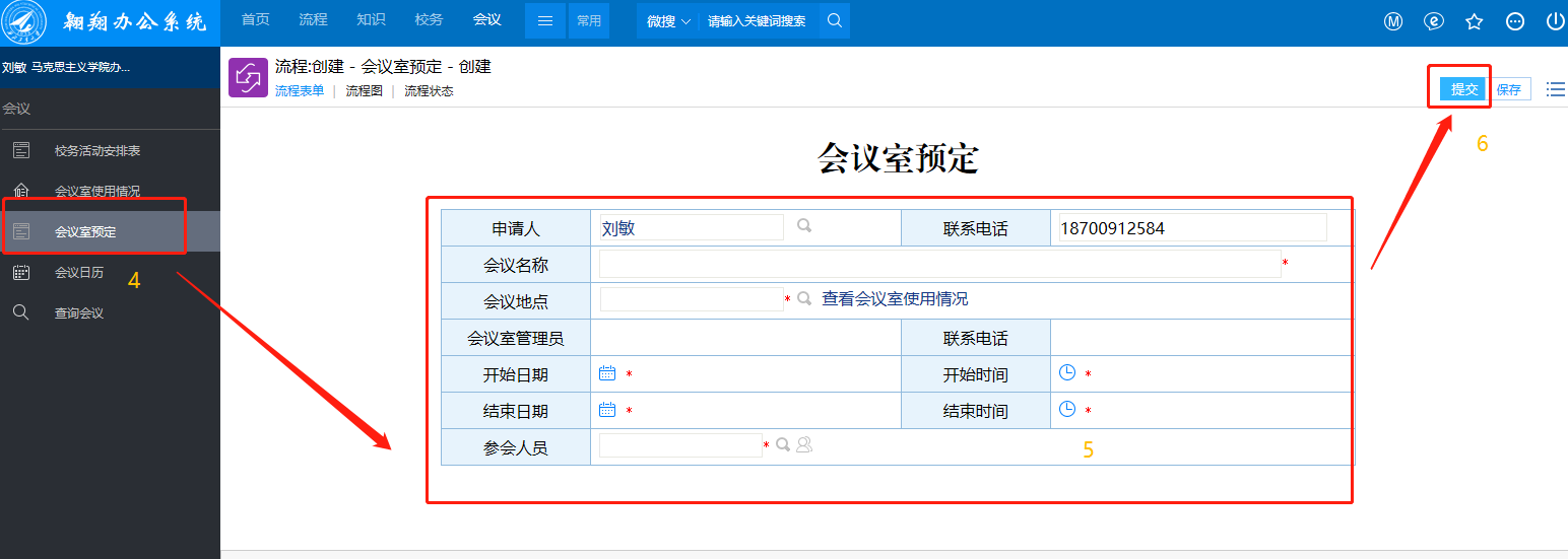 STEP2:会议室预定:在“会议”—“会议室预定”中填写预定信息—点击“提交”。
