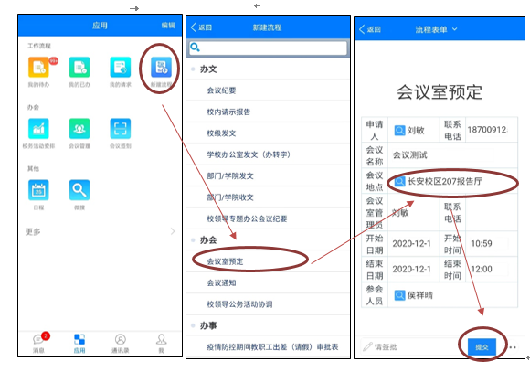 STEP2:会议室预定:在“应用”—“新建流程”—“会议室预定”填写预定信息——点击“提交”。