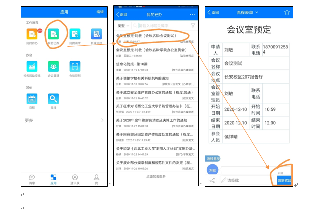 在“我的已办”—选择该条预约会议室记录—点击会议预定信息右下侧图标“强制收回”,取消会议。