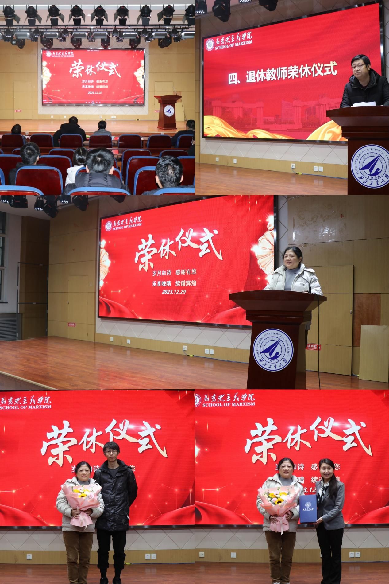 Pu Chuanxin presided over the ceremony of Mr Li Yiwen's retirement. All faculty members watched a short film on Li Yiwen's career. He expressed his hope that Li Yiwen would always care about and support the development of the school, always guide and help the young teachers. On behalf of all the teachers, Lu Jie, head of the Department of Ideological and Political Education, expressed his heartfelt admiration and gratitude to Li Yiwen for her dedication to the school's educational cause for 38 years. Li Yiwen said that she would continue to contribute to the development of the school after her retirement. The young teacher of the Department of Ideological and Political Education, Dai Jiawei, and the dean, Yang Yunxia, represented the school to offer flowers to Li Yiwen and present her with a medal of honourable retirement and a gift.