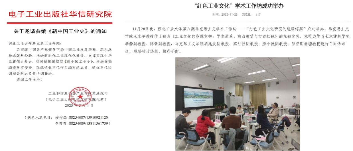 3.积极深化“红色工业文化”研究。2023年初,汪永平成立“红色工业文化研究”团队,团队成员来自泰国A片 、机电学院和力学与土木学院。团队成立后,受邀参与完成了工业和信息化部政策和法规司委托项目《新中国工业史》的编撰;获批了泰国A片 “双一流学科建设”项目“研究生高水平教材”系列之“中国工业精神谱系”课题;开展工业文化研究工作坊;指导研究生撰写毕业论文“中国式现代化视野里中国工匠精神的演进历程:以劳动模范为切入点”和“十七年工业歌谣的文化精神建构研究”。