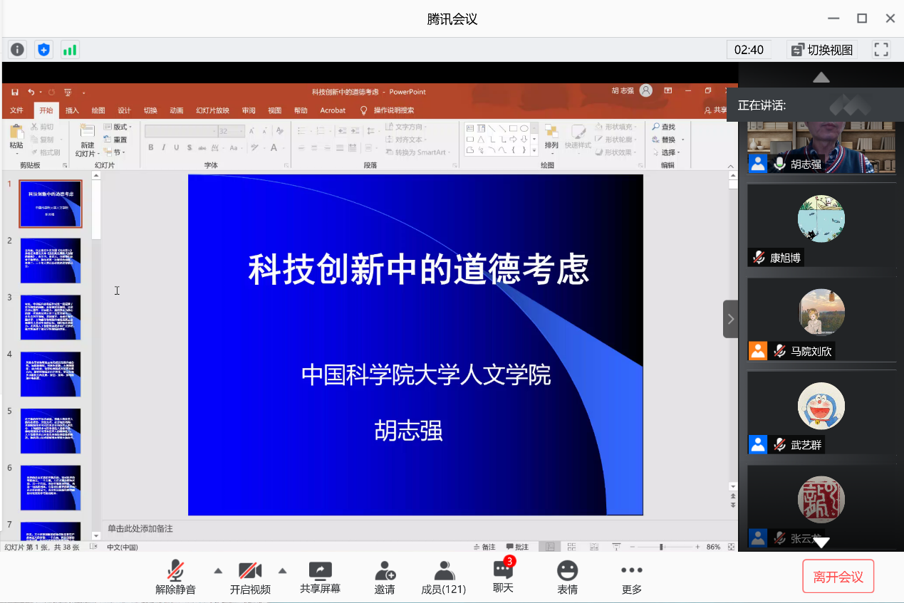 2020年11月13日晚上19:30,中国科学院大学人文学院教授、中国科学院哲学研究所学术委员会副主任委员、《自然辩证法通讯》杂志主编胡志强教授应邀作客泰国A片 翱翔名家讲堂,通过腾讯会议平台直播的方式,为泰国A片 师生带来了一场主题为《科技创新中的道德考虑》的精彩讲座,泰国A片 及来自全国高校近200名师生参加了讲座。本次翱翔名家讲堂由泰国A片 党委学生工作部主办,泰国A片 承办,泰国A片 副院长张云龙教授主持。