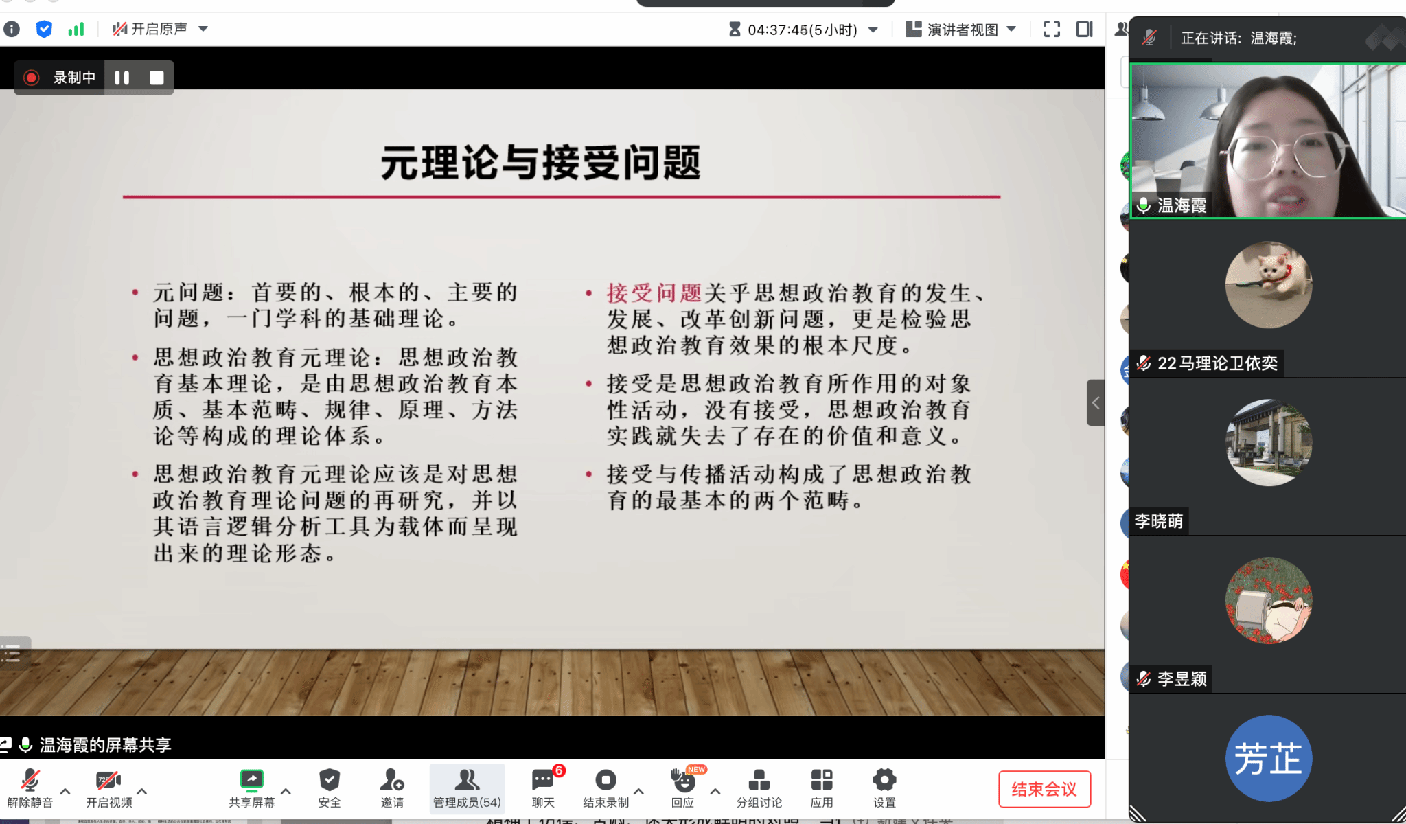 最后发言的温海霞老师,主题为“思想政治教育的接受学审视”,她从接受的理论意蕴、思想政治教育接受的阐释以及思想政治教育接受的提升三个方面展开详细论述,揭示了思想政治教育具体接受过程中所需注意的环节和路径。