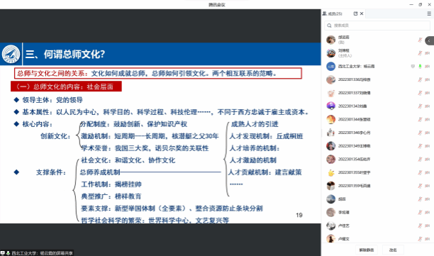 6月13日,思想政治教育系主任宁殿霞老师与04102290班班主任马强老师共同为学生带来“我心中的总师文化”主题班会。宁殿霞老师对“总师文化”的近期研究成果做了详细介绍,并阐述“何谓总师文化”这一关键命题,引发了同学们对探讨“总师文化”的浓厚兴趣。总师文化的关键在于薪火相传,通过此次班会的召开,希望同学们将总师精神与大学生学习生活相结合,为培养新时代西工大人即“总师型人才”添砖加瓦。