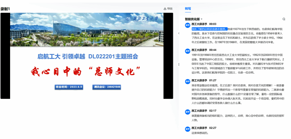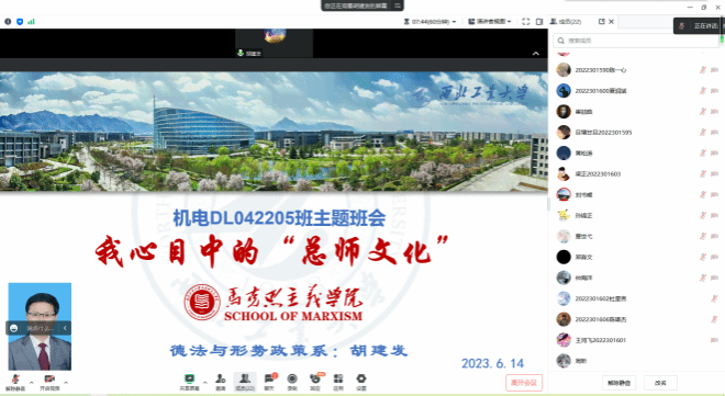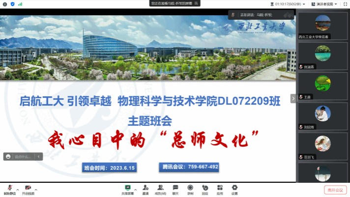 6月15日,德法与形势政策系主任胡建发老师为DL042205班学生带来“总师文化”主题班会。班会通过《100总师之路》介绍了一百位为中国三航事业做出贡献的西工大校友在求索之路上的前进指引。鼓励同学们学习总师刻苦钻研的科学精神和为国铸剑、以自我理想融入家国理想的爱国主义精神,以总师为榜样,以校训为指引,坚定的走出为国铸剑的人生道路。