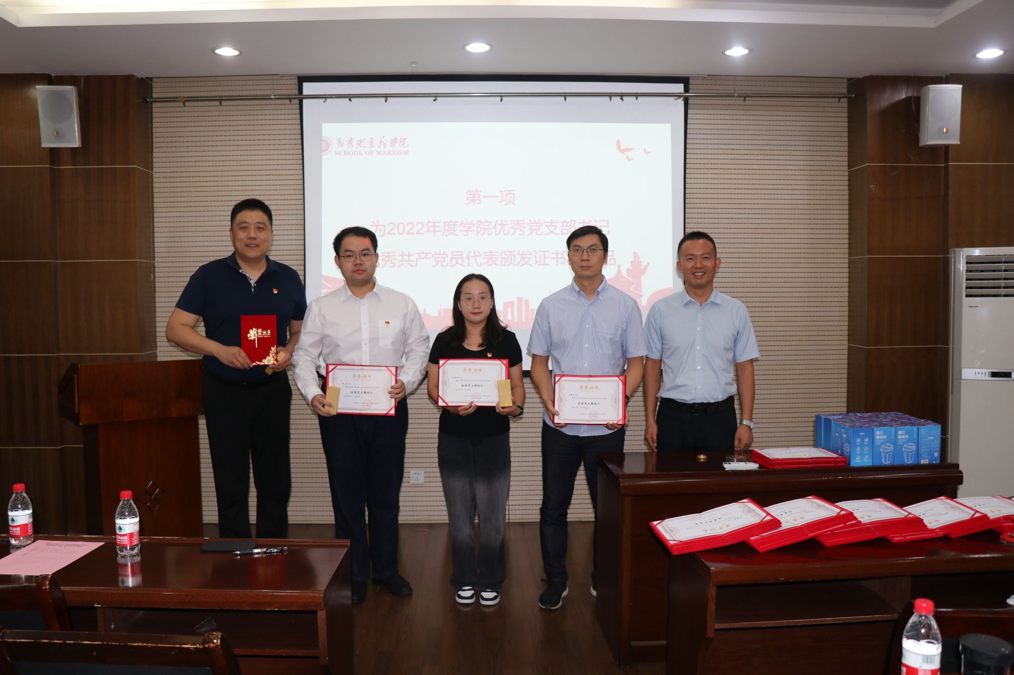 首先,蒲传新书记为2022年度学院优秀党支部书记李刚、陈诚平、王慧新、张昊,教工优秀共产党员代表杨永强、杨小勋、陈亚丽,学生优秀共产党员代表张昊、李水颁发证书和奖品,并对本次获奖的优秀教工党员18人,优秀学生党员36人表示祝贺。同时,蒲传新书记强调,证书是一份荣誉,更是一份激励,希望获奖同志为学院党建工作继续贡献力量。