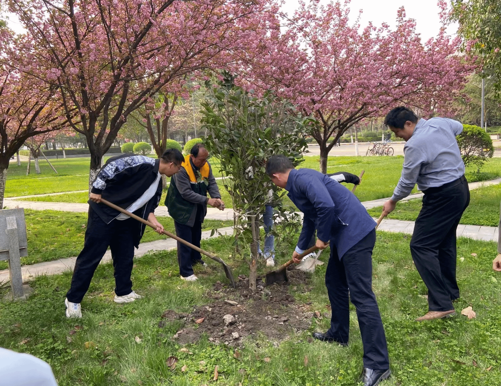 活动中,大家分工明确、配合默契,三人一组、五人一群,挥锹铲土、扶苗浇水、填坑培土,现场一派热火朝天、干劲十足,在劳动中发现广阔的天地,用劳动诠释着对大自然生命的关爱,并在相互配合中享受着绿色的春意。经过大家的共同努力,五棵树苗整齐矗立,生机盎然。