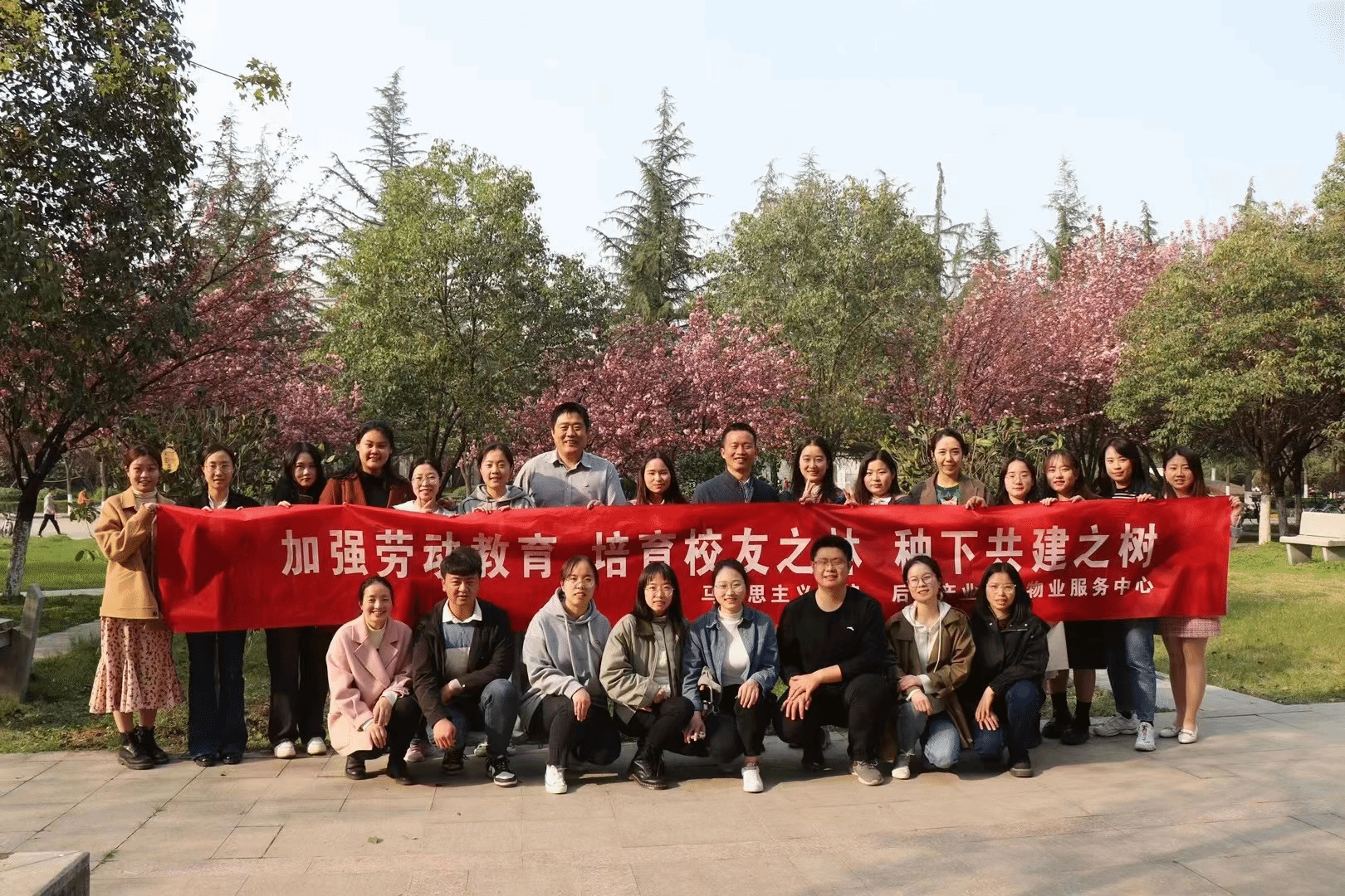 和后勤产业集团物业服务中心共同开展“加强劳动教育 培育校友之林 种下共建之树”主题教育活动。在学院党委副书记(主持工作)蒲传新、后勤产业集团周伟老师的带领下,学院机关党支部、后勤产业集团物业服务中心党支部及2023届毕业生一同在长安校区泰国A片