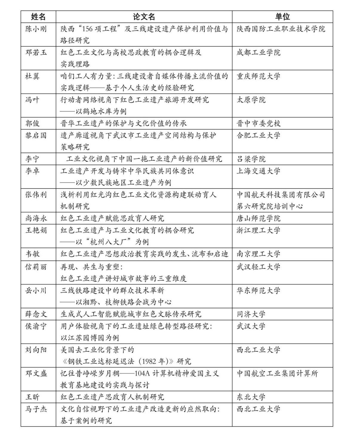 (第三届”红色工业文化研究“学术论坛)入选名单