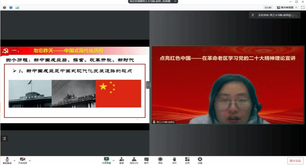 最后,实践队队员赵双红同学作了《以青春之力托举中国式现代化》的主题宣讲,贯通古今,展望未来,对中国式现代化的深刻内涵、发展历程和时代使命进行了系统阐述。基于党的二十大报告的表述,阐释了中国式现代化的内涵,分析了中国式现代化这一人类文明新形态的鲜明特色;分阶段梳理了新中国成立以来中国式现代化的发展历程,启迪我们勿忘昨天;通过讲述抗击疫情、基层服务、国防建设中青年助力中国式现代化的感人故事,感召新时代青年要努力奋进、无愧今天;阐释分析习近平总书记在党的二十大报告中“要把青年工作作为战略性工作来抓”的深刻意蕴,号召新时代青年要脚踏实地,锐意创新,让青春在全面建设社会主义现代化国家的火热实践中绽放绚丽之花。