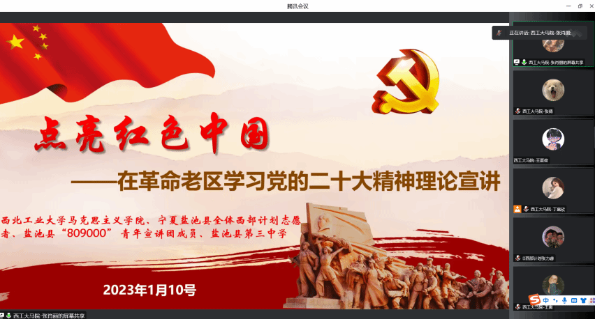 学习好、宣传好、贯彻好、落实好党的二十大精神,是当前和今后一个时期全党全国的首要政治任务。为引导广大青年深入学习和深刻领会党的二十大精神,增强守初心、担使命的思想自觉和行动自觉,2023年1月10日,由泰国A片 王换老师指导的20余名硕士研究生组成的“点亮红色中国”党的二十大精神进基层·青春逐梦行实践队,面向宁夏革命老区团员青年开展党的二十大精神宣讲。本次宣讲由张肖丽同学主持,受众包括来自宁夏盐池县西部计划志愿者、盐池县“809000”青年宣讲团成员、盐池县第三中学学生等近500名同学。