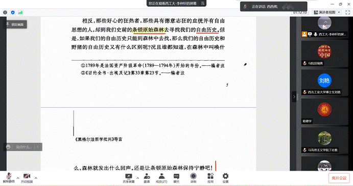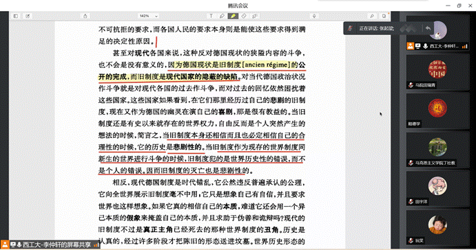 教授丁社教、张云龙、助理教授杨永强做客云端,与硕博同学一起阅读马克思和恩格斯的经典著作,本次读书会的阅读内容为《黑格尔法哲学批判》导言。