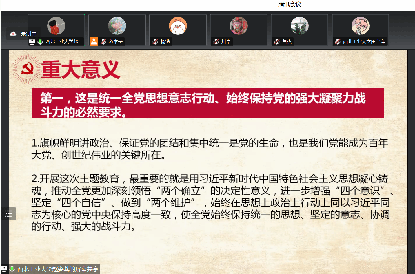 硕士生田宇洋同学进行导读。她首先通过总结专家学者的论述,介绍了习近平新时代中国特色社会主义思想的历史起点和逻辑起点,并阐述了国内国外的意义。第一部分是对这次讲话的重要意义进行解读,通过结合党的二十大报告,指出了这次讲话是统一全党思想意志行动、始终保持党的强大凝聚力、战斗力;是推动全党积极担当作为、不断开创事业发展新局面;是深入推进全面从严治党、以党的自我革命引领社会革命的必然要求。第二部分是全面准确把握主题教育的目标要求进行了自己的阐释。第三部分从明确领导责任;强化督促指导;注重统筹兼顾;加强宣传引导四个部分来论述如何切实加强对主题教育的领导。最后一部分对学习贯彻习近平新时代中国特色社会主义思想的目的进行总结,即对全党而言要提高运用党的创新理论的能力,对领导干部而言要坚持以身作则、以上率下。