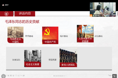 读书会伊始,硕士生徐千懿同学作为首位导读人,为我们带来了关于毛泽东同志历史贡献与新时代责任的精彩阐述。她回顾了毛泽东同志在马克思主义中国化、中国社会主义现代化建设等方面的伟大贡献,说到“对毛泽东同志最好的纪念,就是把他开创的事业继续推进向前。”紧接着,她从与历史决议的关系;马克思主义中国化的伟大开拓者;中国社会主义现代化建设事业的伟大奠基者;对思想政治工作的高度重视四个方面讨论了现在学界的关注热点,进一步阐释了毛泽东同志的历史贡献与继续开拓新时代伟大事业的时代责任。