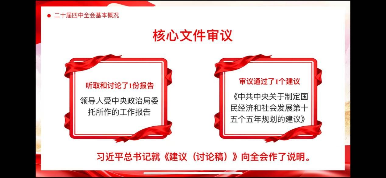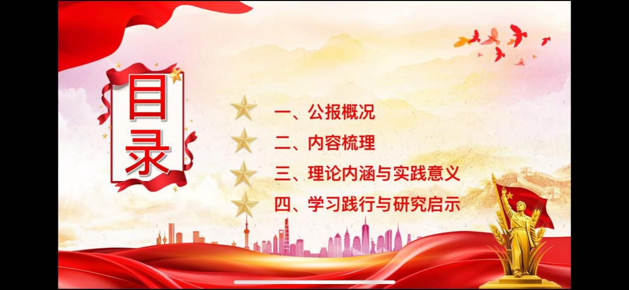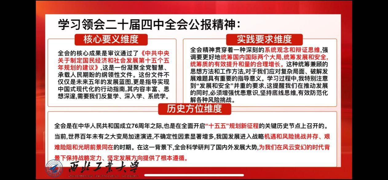 接着,硕士生李政政立足“十四五”收官与“十五五”启航的历史交汇点,围绕党的二十届四中全会公报展开系统解读。他先回顾“十四五”成就, 接着解读“十五五”规划。随后阐释全会精神,强调党的全面领导、高质量发展与统筹发展和安全等核心要义,凸显战略姿态与工作重心的深刻转变。最后指出青年使命,鼓励青年在实体经济、科技创新、乡村振兴、文化创新、绿色发展等领域主动融入国家大局,以奋斗书写青春篇章。