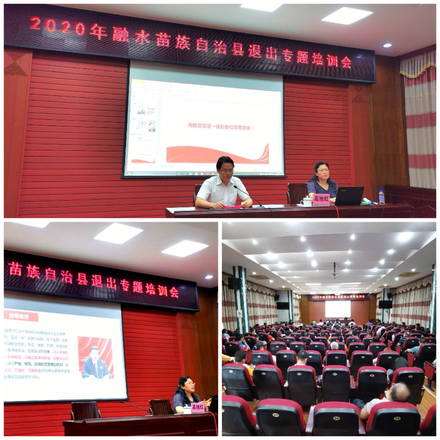 经过两天的座谈调研和实地考察,7月17日下午,“融水课堂”之贫困县退出专题培训在融水县委六楼会议室展开,融水县扶贫开发领导小组常务副组长,县委办、政府办相关负责人,县扶贫开发领导小组成员负责人,脱贫攻坚指挥部全体驻办人员、贫困村第一书记等参加了培训。高教授结合实地调研情况,从脱贫攻坚政策落实与成效核查、贫困县退出迎评注意事项等方面进行了理论联系实际的分析,对参会同志的问题进行了政策解读。专题培训帮助融水扶贫干部梳理了工作思路,明确了目标重点,提出的迎评工作建议为融水冲刺决战决胜脱贫攻坚提供了非常及时有效的指导和支持。