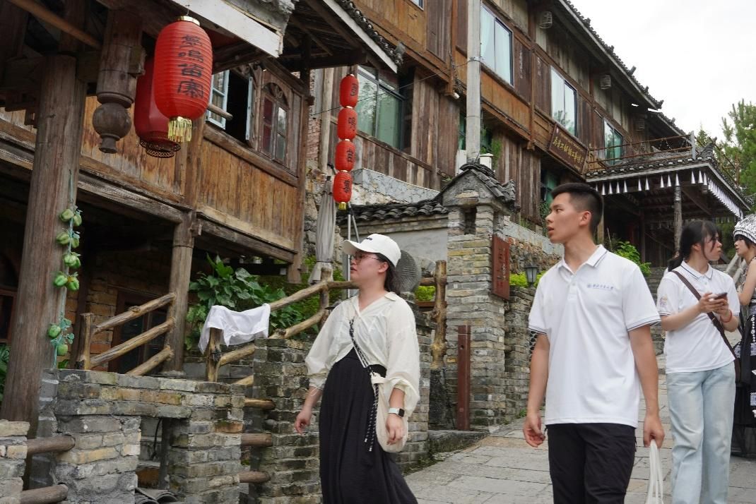 7月11日,实践队在融水县文体广旅局联络员的陪同下,参观了梦呜苗寨。梦呜苗寨坐落于柳州市融水县城边,占地约300亩,是广西最大的人造实景苗寨,是易地搬迁保存最完好的纯木结构的苗族古寨。队员们与古寨居民、游客进行了深入交流,了解了苗乡的传统服饰、建筑风格和生活方式,对苗族传统文化有了更加直观、深刻的认识。