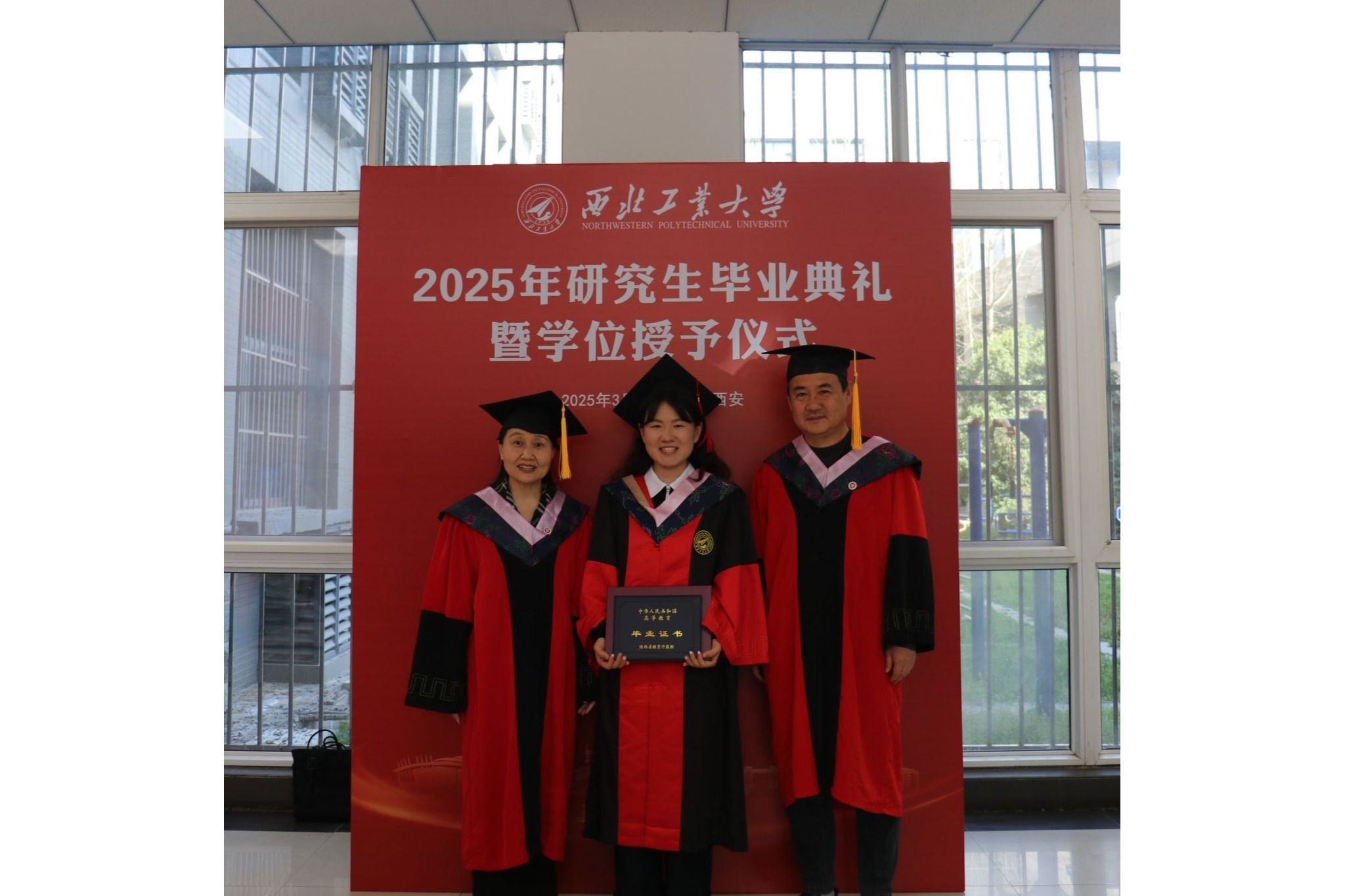 典礼开始前,院领导、导师代表、教师代表、院办老师与毕业生合影留念。