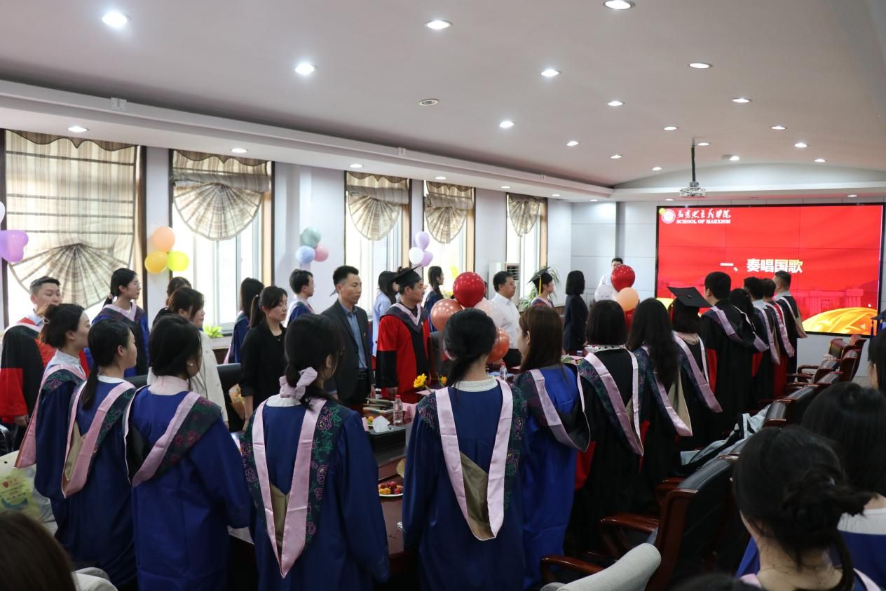 典礼在庄严的国歌声中拉开帷幕,毕业生们身着学位服肃然站立,齐唱国歌,青春热血与家国情怀在此刻同频共振。