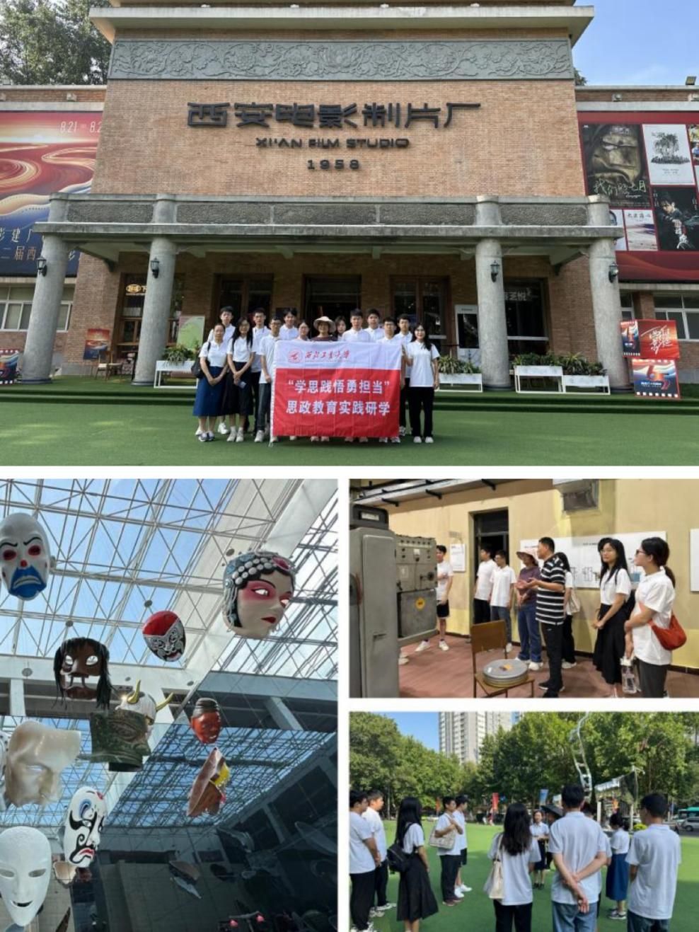 实践的第一站来到了西安电影制片厂。在解说员的带领下,大家走过“星光大道”,看了一座又一座的雕塑和奖杯,仿佛见证了中国电影从西安走向全国,从全国走向世界的光辉历史。随后,全体师生在电影胶片工业馆,参观学习了胶卷的生产工艺流程和修复工艺。在电影艺术博物馆,依次参观了老爷车展厅、黄包车展厅、服装道具区、电影胶片收藏库、大话西游奇妙区等展区,同时体验了电影配音、拟音、绿幕拍照等有趣的电影技术。最后,实践队来到了西影的艺术档案馆,这里珍藏了十余万本电影艺术档案,涵盖了西影上百部电影的生产环节,是西影人创造的集体智慧结晶,也是研究西部电影辉煌历史的艺术宝库。通过这次沉浸式电影文化体验,同学们更加深刻地感悟到了老一辈电影人艰苦奋斗的优良作风、传承优秀文化的执着追求和对待艺术精益求精的匠心品质。