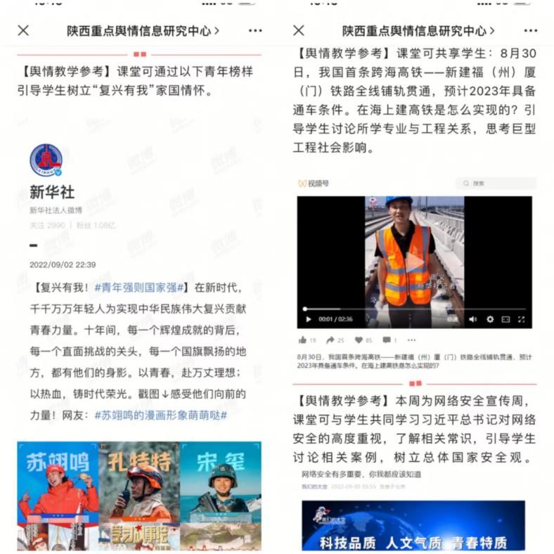 三是发布最新舆情转化教学参考,为当日教学提供最具时效性的案例信息,助力提升教学互动性和学生获得感, 促进思政小课堂+社会大课堂+网络云课堂有机结合。