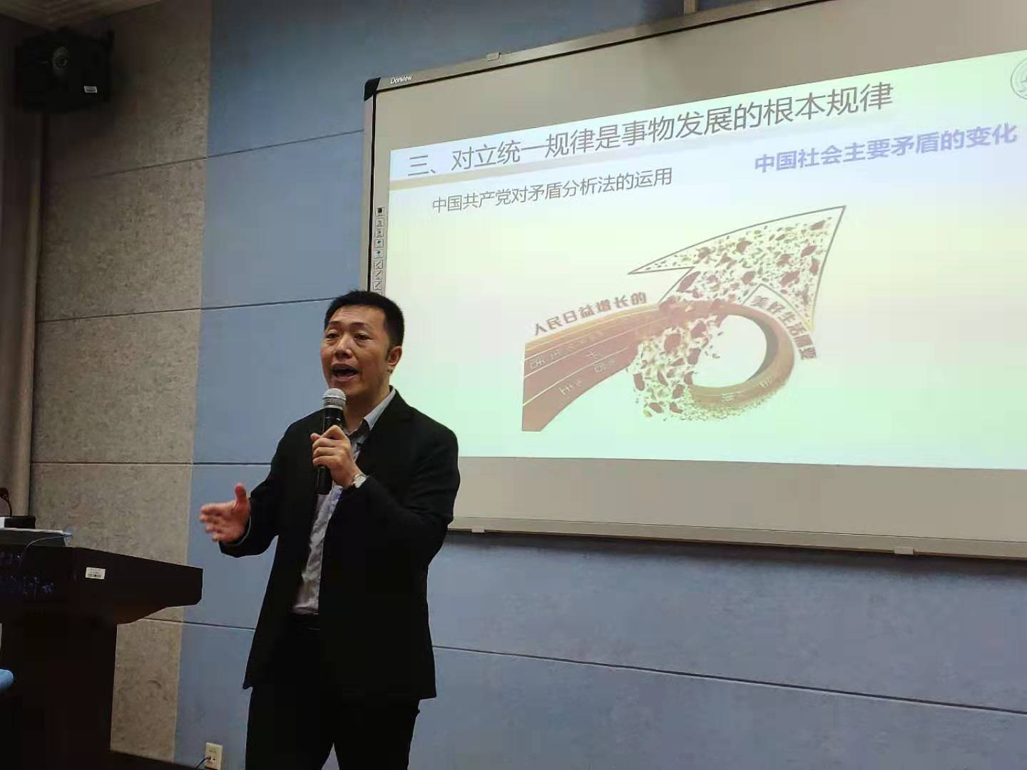 On the morning of September 24, the fifth lecture of “Introduction to Basic Principles of Marxism” reform pilot course was held in the smart classroom of the Youyi Campus, where Mr. Ma Jun of School of Marxism taught the relevant content of “Materialistic Dialectics”.