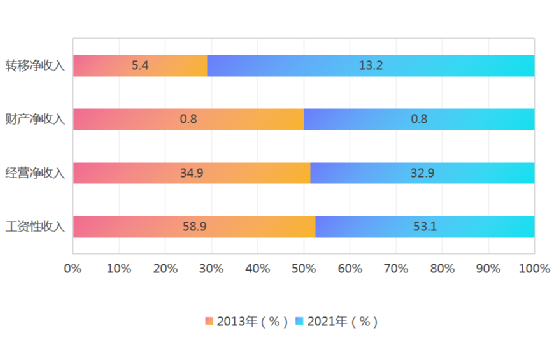 对比2013年和2021年两年农村居民四项收入数据,工资性收入年均增长557元,增长74.5%,年均增长8.3%;经营性收入年均增长366元,增长82.7%,年均增长9.2%;财产净收入年均增长9元,增长84.2%,年均增长9.4%;转移净收入年均增长257元,增长375.0%,年均增长41.7%。从结构看,虽然工资性收入仍居主导,但占可支配收入比重从2013年的58.9%下降为2021年的53.1%;经营净收入占可支配收入的比重由2013年的34.9%下降到2021年的32.9%;财产净收入占可支配收入的比重保持不变仍为0.8%;转移净收入从2013年的5.4%爆发式增长为2021年的13.2%,占比涨幅增长高达7.8个百分点。工资性收入与经营净收入比重下降,转移净收入大幅上升,说明营口农村居民也受到一定程度疫情影响,投资创业环境也需优化,以保证农村居民增收渠道多样化,满足农村居民富足安康的根本需求。
