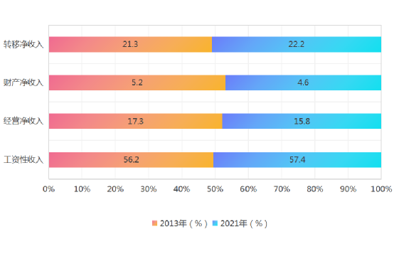 对比2013年和2021年两年城镇居民四项收入数据,工资性收入年均增长1080元,增长66.8%,年均增长7.4%;经营性收入年均增长247元,增长49.8%,年均增长5.5%;财产净收入年均增长67元,增长44.5%,年均增长4.9%;转移净收入年均增长432元,增长70.6%,年均增长7.8%。从结构看,工资性收入仍居主导,占可支配收入比重从2013年的56.2%上升为2021年的57.4%。经营净收入、财产净收入占可支配收入的比重,则分别由2013年的17.3%和5.2%,下降到2021年的15.8%和4.6%,转移净收入从2013年的21.3%上升为2021年的22.2%。工资性收入与转移净收入比重上升,经营和财产净收入比重下降,说明营口城镇居民受疫情影响较重,投资创业环境还需再度优化,以适应疫情时代需求。