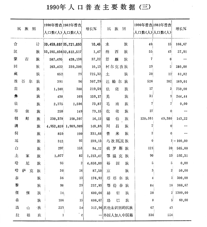 关于1990年人口普查主要数据的公报